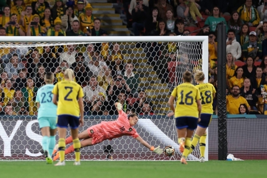 | Thủ thành Mackenzie Arnold bay người bắt bóng sau một cú tạt từ phía Thụy Điển. Ảnh: Getty Images |