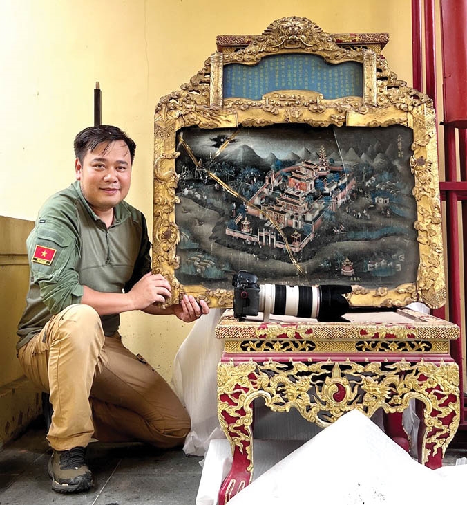 | Nguyễn Phong bên bức tranh gương “Thiên Mụ Chung Thanh” từng xuất hiện trong ảnh tư liệu xưa |