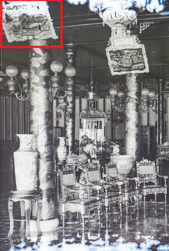 | Nội thất điện Cần Chánh (bức tranh gương phía góc phải là “Thiên Mụ Chung Thanh” |