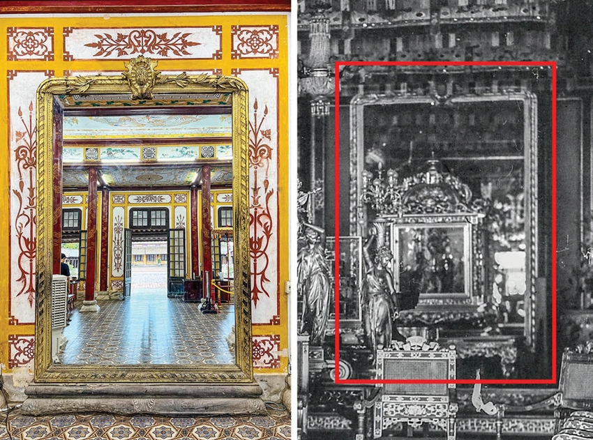 | Tấm gương lớn đặt phía sau ngự tọa điện Cần Chánh. Trên gương có 2 chữ Đồng Khánh (chiếc gương được người Pháp làm tặng vua Đồng Khánh lúc ông lên ngôi) |