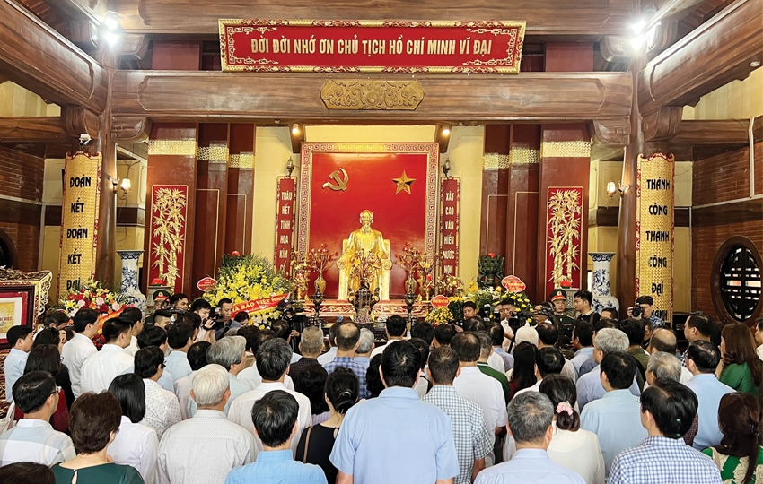 | Các thế hệ nhà báo thành kính dâng hương, dâng hoa lên Bác tại Nhà tưởng niệm Chủ tịch Hồ Chí Minh ở Đèo De, xã Phú Đình, khu di tích lịch sử ATK Định Hóa |