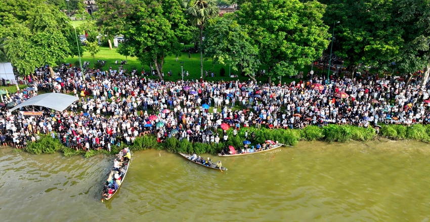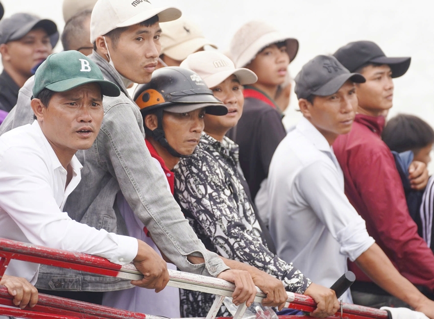 | Từ sáng sớm, 2 bờ sông Hương đã chật cứng khán giả đến cổ vũ cuộc đua |