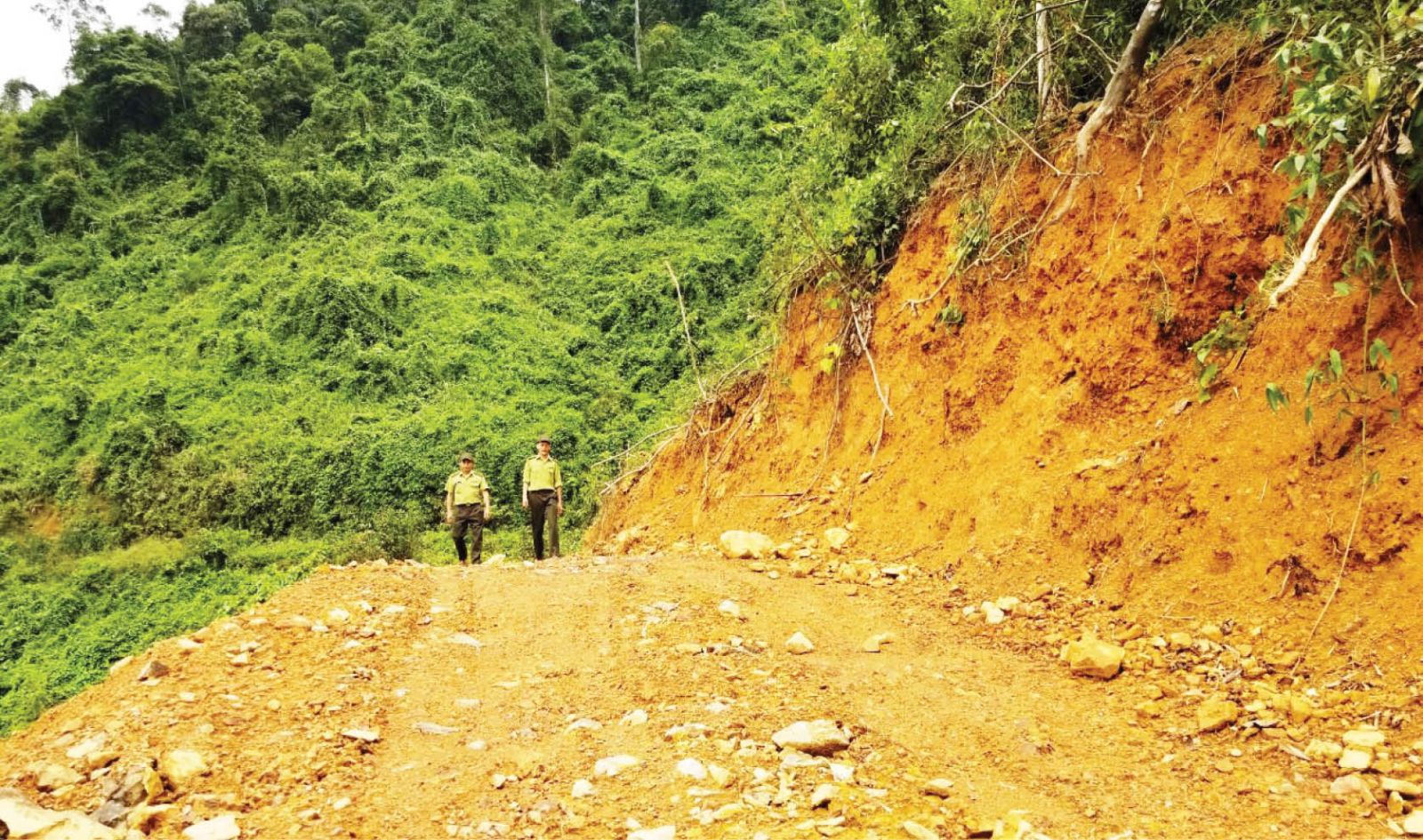 Tại khu vực Khe Ao gần Trạm Kiểm lâm Hương Lộc, tuyến đường tuần rừng bị lũ “xé” từ năm 2020 nay được hoàn trả lại khá sơ sài. Tại khu vực ngầm tràn đã bị lũ cuốn, một số đoạn được đắp lại bằng đất đá tạm bợ. Trước đây, đoạn tuyến này, lực lượng tuần rừng có thể đi lại bằng xe máy nhưng giờ rất khó khăn. Cách khu vực này chừng 300m, đã xảy ra hiện tượng sạt lở với quả đồi bị nứt phía trên...