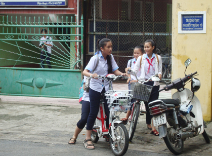 Học sinh đi xe đạp điện không đội mũ bảo hiểm xảy ra khá phổ biến
