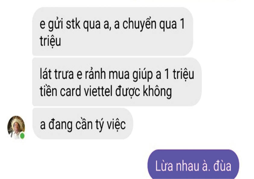 Sáng một ngày đầu tháng 3, tôi nhận được tin nhắn facebook của một đồng nghiệp với nội dung: “Em rảnh không? E gửi số tài khoản, anh chuyển qua 1 triệu. Trưa em rảnh mua giúp anh 1 triệu tiền card Viettel được không. Anh đang cần tí việc”.
