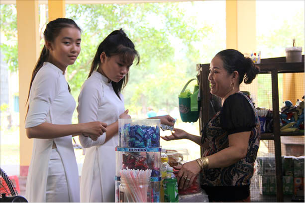Kết thúc tiết học đầu tiên buổi sáng ngày thứ ba, chúng tôi có thời gian quan sát hoạt động của căng tin Trường THPT Phú Bài. Ngoài một số em mua dụng cụ học tập, phần đông học sinh xuống đây để ăn sáng, mua nước giải khát. Căng tin rộng chừng 30m2, được xếp bàn ghế ngay ngắn. Sau tiếng trống kết thúc giờ giải lao, chủ căng tin nhắc nhở học sinh trở lại lớp học rồi nhanh chóng quét dọn, lau bàn sạch sẽ. Công việc này đều đặn diễn ra giữa các tiết học, kéo dài từ 6 giờ sáng đến 5 giờ 15 phút chiều, khi học sinh tan học. Chị Ngô Thị Thu Bê chia sẻ câu chuyện: “Tui bán ở đây từ năm 2004, hằng ngày phục vụ khoảng 100 học sinh, riêng ăn sáng có 60-70 em. Căng tin chủ yếu bán văn phòng phẩm, bánh mỳ, nước giải khát và một số bánh kẹo thông thường, tuyệt đối không bán thuốc lá và những chất kích thích. Ngoài cam kết với nhà trường, tui xem học sinh như con mình, các mặt hàng không tốt, tui dứt khoát không bán. Những học sinh có ý định đánh bài ở đây, tui cũng không cho”.