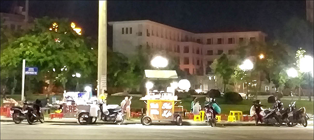 Hằng đêm có nhiều hàng quán như thế này lợi dụng vỉa hè, thảm cỏ, đường đi bộ Bia chiến công 11 cô gái Sông Hương để kinh doanh, buôn bán