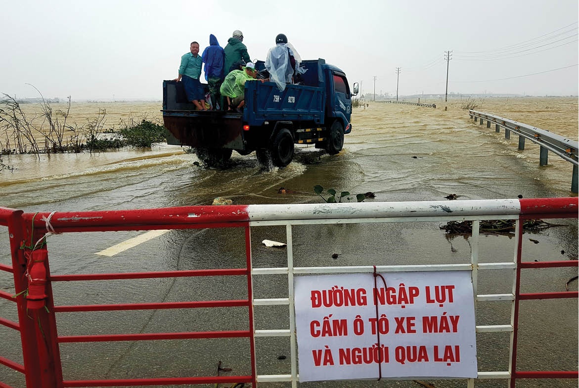 Mặc cho hàng rào và biển cảnh báo ấy, nhiều người trả tiền để được đưa xe máy và người lên một chiếc xe tải để đi qua. Một vài người khác liều mình chạy băng qua tuyến đường ngập sâu nước, giữa mưa gió bão bùng. Bất chấp lời khuyên ngăn của chúng tôi, họ vẫn đi và nói có lý do riêng, bằng mọi giá phải về nhà trước giờ bão đổ bộ.