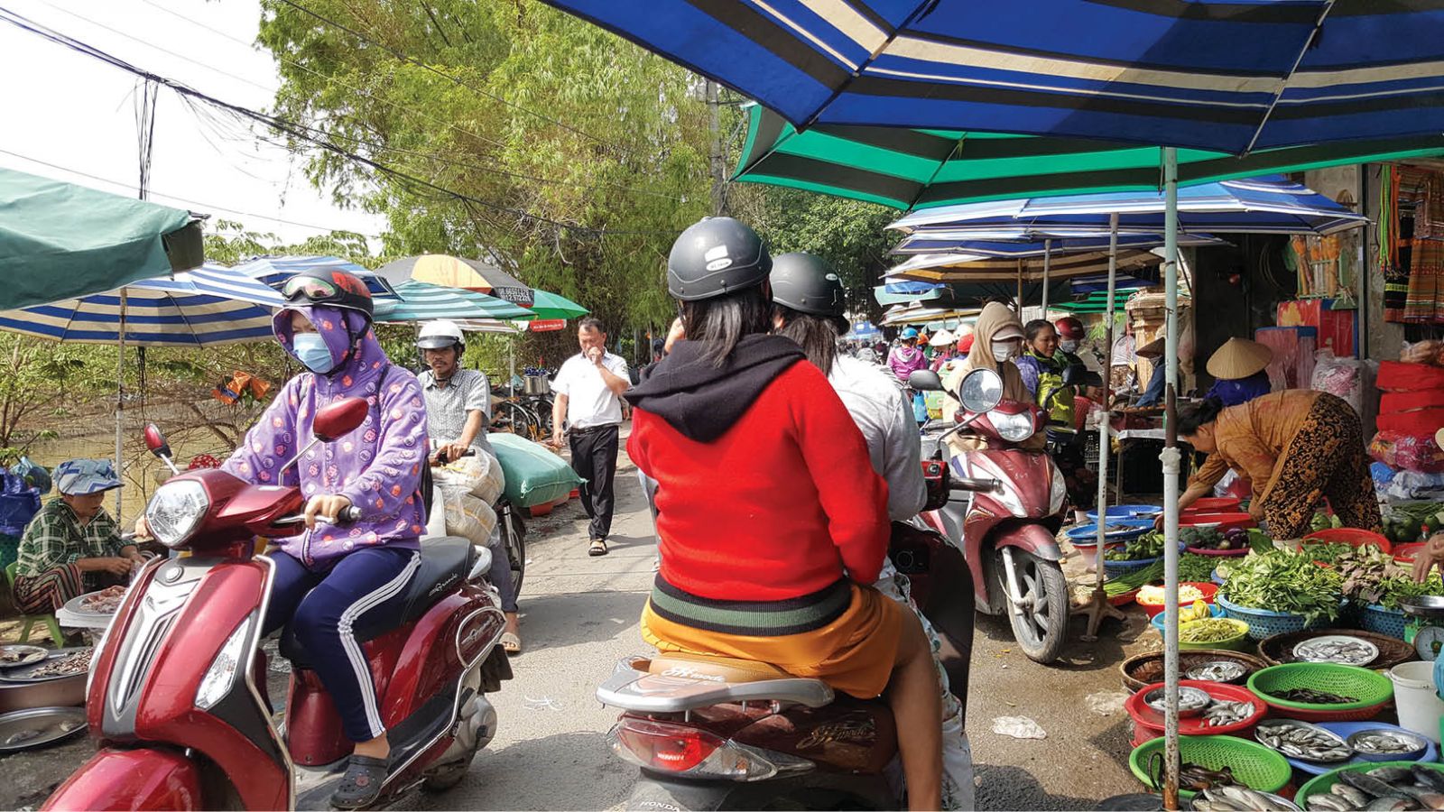 Những chiếc xe máy đi qua phải nhích từng tý một để tránh hàng hóa bày giữa lòng đường và thậm chí đụng phải những người đi xe máy lại dừng giữa lòng đường để mua hàng. Đoạn đường chưa đến 200m mà chúng tôi mất gần nửa giờ đồng hồ mới qua được.