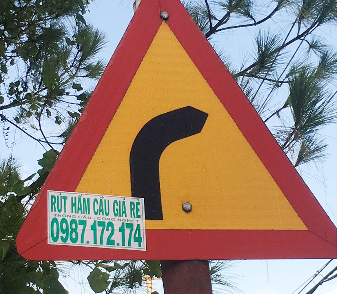Rải tờ rơi quảng cáo - nhất là quảng cáo cho vay “trả góp”, “vay không thế chấp”, “giải ngân trong ngày, thủ tục đơn giản”… trước cổng nhà dân, trước các ngõ hẻm nơi nhiều người qua lại; hoặc các tờ rao vặt dán ở cột điện, ở các bức tường dọc phố, khu dân cư… thấy đã mệt mỏi rồi. Bây giờ lại còn bắt gặp cả cái kiểu tranh thủ biển báo giao thông để niêm yết mời gọi dịch vụ “Rút hầm cầu giá rẻ” như thế này nữa (Xem ảnh chụp ở đường Lê Ngô Cát, con đường dẫn đến các điểm du lịch trọng điểm của Huế: Lăng Tự Đức, Đồng Khánh, đồi Vọng Cảnh, chùa Từ Hiếu…) thì đúng là không còn gì để mà bình, mà luận!