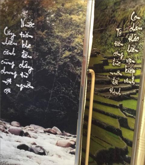HNN - Trên một chuyến tàu hỏa từ phía Nam ra Huế, xếp gọn hành lý, tôi ngả lưng thoải mái lên giường nằm được trải “ra” trắng tinh, định nhắm mắt thư giãn một lúc, bỗng thấy trước mặt mình một bức tranh kèm hai dòng chữ kiểu thư pháp dễ đọc: “Nước trăm khe đều chảy từ nguồn / Cây trên cành cùng chung một cội”