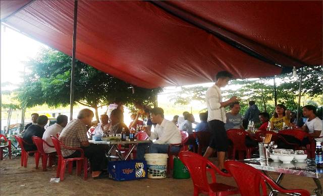Cũng đã lâu không bước chân tới nên tôi khá bất ngờ khi chứng kiến một loạt “nhà hàng” nơi đây. Mỗi khu đất là từng quán hàng với tên gọi mới nghe đã thấy hấp dẫn. Gọi là quán cho sang nhưng thực ra là che bằng những tấm bạt nilon, có quán căng bạt rộng 40-50m2 bằng cách lợi dụng các hàng cây để buộc dây chằng néo. Có quán làm sẵn khung nhôm (hoặc sắt) để khi có mưa thì kéo ra che, nhưng cũng có quán chỉ bày la liệt bàn ghế. Theo người bán cho biết, khi mưa họ bưng bàn chạy vào nhà cho khách, không mưa thì ngồi giữa không gian cho thoáng. Nhà cũng là quán ở phía trong, bên kia đường nhưng ít khi có khách ngồi. Có lẽ cũng để thuận tiện và nhẹ nhàng nên bàn ghế ở đây phần lớn bằng nhựa, không có bàn cố định. Chẳng biết họ có phân lô ranh giới không nhưng khoảng cách các quán cách đều nhau, phân biệt quán này với quán khác bằng bảng hiệu đặt giữa từng khu đất. Bảng cũng được quảng cáo các món nhậu đủ loại, tuy gọi là bình dân nhưng nghe ra hầu hết là đặc sản từ trên rừng xuống dưới biển.
