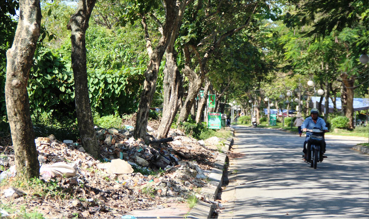 Không dừng lại ở việc lấn chiếm công viên, nhiều người đã đổ rác thải tràn lan dọc theo vỉa hè khiến tuyến đường càng nhếch nhác. Rác xây dựng, rác thải sinh hoạt... lấn hết đường đi bộ; hệ thống cây xanh dọc theo vỉa hè cũng bị ảnh hưởng, nhiều gốc cây bị rác thải đè lên có nguy cơ bị bức tử.
