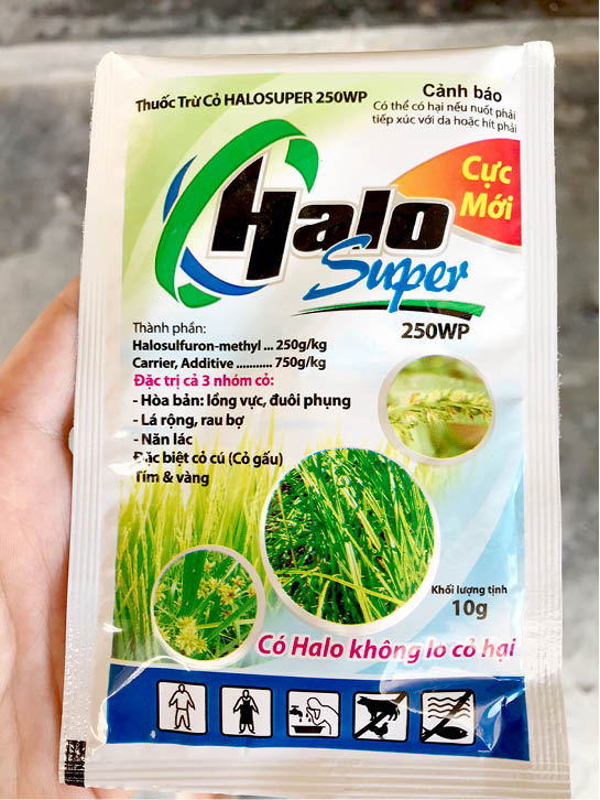 Sau khi mới bơm hết 1 bình thuốc Halosuper 250WP, vài ngày sau ra thăm đồng ông Bắc phát hiện lá lúa bị bầm đen và héo chết dần. Thấy vậy, ông Bắc nhanh chóng đi mua thuốc bón rễ và bón lá về tiếp tục bơm cho lúa nhưng vẫn không khắc phục được, cây lúa chết ngày càng nhiều. Đến nay số diện tích đã được bơm thuốc diệt cỏ Halosuper 250WP bị chết héo gần như hoàn toàn.