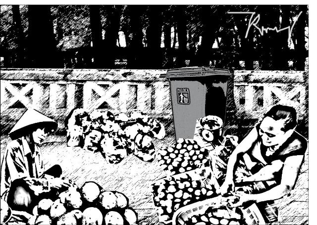 Chỉ cần để ý, sẽ thấy ngay dưới đường cống thoát nước phía sau những người bán trái cây rong phía bên đường tiếp giáp với Đàn Nam Giao nhiều rác thải các loại. Có vẻ như những người buôn bán nhỏ ở khu vực này thảy rác xuống đây cho tiện, cho dù sát đó đã có một thùng rác của Công ty Môi trường đô thị. Nhân chuyện này, tôi cũng muốn nói rằng, cần phải có một cơ chế gì cho những người xem đây là chỗ buôn bán, sinh nhai hàng ngày. Nếu trước mắt, chưa thể đưa họ về một vị trí nào đó ổn thỏa hơn, không ảnh hưởng đến cảnh quan đô thị và di tích thì cũng phải yêu cầu họ tuân thủ các quy định về vệ sinh môi trường và trật tự đô thị cũng như không ảnh hưởng đến giao thông khi mật độ lưu thông qua khu vực này hàng ngày rất lớn. Cần phải đề nghị và có cơ chế để chị em buôn bán nhỏ ở đây xem việc gìn giữ môi trường là công việc gắn với mưu sinh hàng ngày của chính họ. Mặt khác cũng phải nói thêm là việc bán hoa quả đã được cắt, xẻ ngay gần thùng rác công cộng vừa không đảm bảo vệ sinh, vừa mang đến một cái nhìn xấu về ý thức vệ sinh và an toàn thực phẩm trong mắt người qua đường.