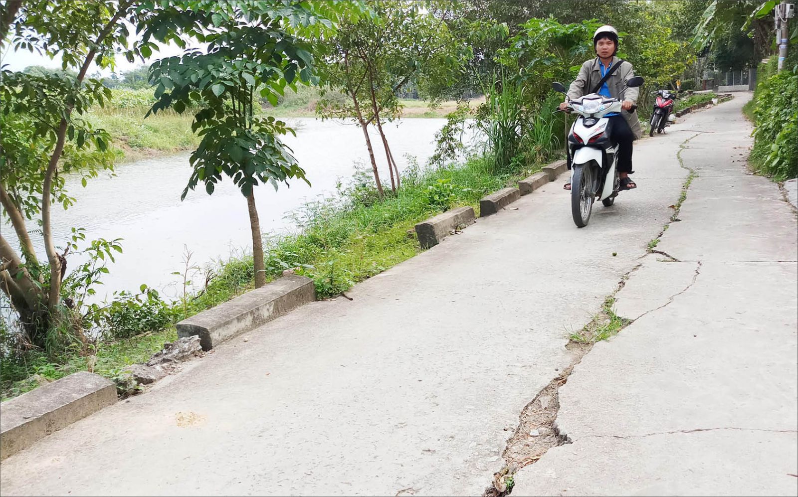Có mặt tại đường Nguyễn Phúc Thụ, chúng tôi nhận thấy nhiều vết nứt chạy dọc con đường hẹp, kéo dài hơn cả 100 mét ngay sát dòng sông khiến hàng chục hộ dân đi lại khó khăn và lo sợ. Nhiều chỗ xuất hiện “hàm ếch” lớn.