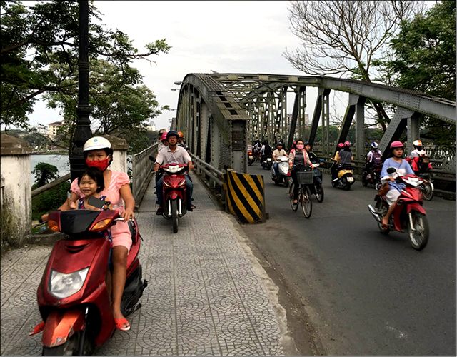 Hàng xe máy ngang nhiên chạy trên phần đường dành cho người đi bộ cứ kéo dài mãi không ngớt. Người trẻ thì quá nhiều nhưng người trung tuổi chở vợ, cả bà mẹ trẻ chở con nhỏ cũng vô tư rú xe lên lối đi dành cho người đi bộ khiến nhiều du khách nước ngoài đang tản bộ ngắm cảnh trên cầu không khỏi trố mắt nhìn.