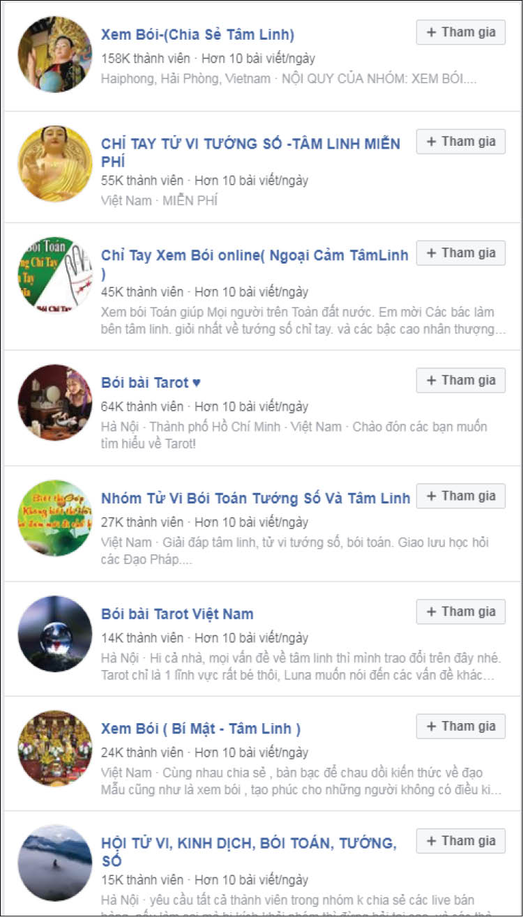 Chỉ cần gõ các cụm từ liên quan đến bói toán trên facebook thì ngay lập tức người dùng nhận được hàng nghìn kết quả với những tài khoản cá nhân của các đối tượng hành nghề bói toán, thậm chí còn có hàng nghìn fanpage với hàng vạn lượt người theo dõi. Các đối tượng tự xưng là “cô”, “cậu” hoặc “thầy” thường xuyên tổ chức livestream, kêu gọi nhiều người tham gia chỉ đến khi có đông đảo người tương tác các đối tượng này mới tổ chức xem bói.