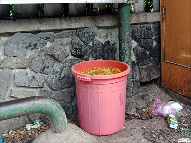 Cái thùng trông rất gớm giếc, lềnh bềnh thức ăn thừa và hôi thối. Nó được đặt sát nơi hành khách ngồi chờ xe buýt, xung quanh rơi vãi thức ăn thừa, rác.