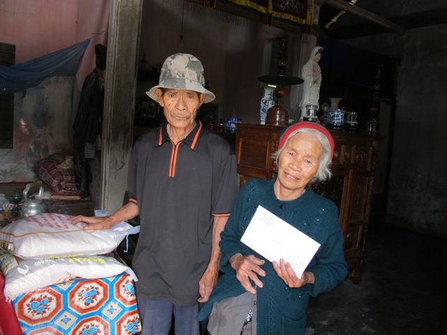 Vợ chồng bà Hoàng Thị Quyết vui mừng khi nhận quà