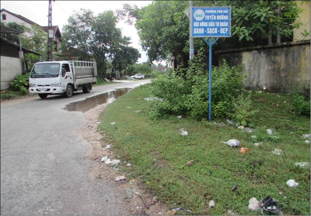 Tình trạng tương tự cũng xuất hiện tại tuyến đường tự quản của Hội Nông dân phường Phú Bài trên đường Trưng Nữ Vương hay tuyến đường tự quản của Đoàn thanh niên phường Thủy Lương trên đường Võ Xuân Lâm với vô kể các loại rác ở khu vực xung quanh thậm chí là ngay dưới chân tấm biển “Tuyến đường tự quản”.