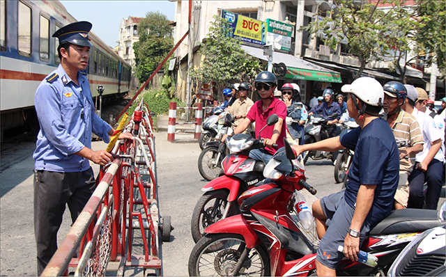 Đảm bảo an toàn tại gác chắn trên đường Điện Biên Phủ, TP. Huế. Ảnh: P. Thành