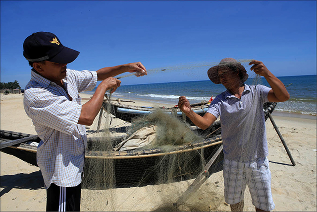Ngư dân Huỳnh Táng (thôn Tân An, Phú Thuận) phải thay mới lưới cụ do cá nóc cắn phá