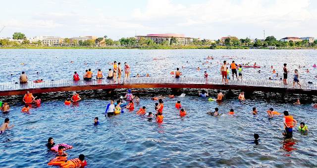 Nhiều người dân đến đây cho biết, vì thời tiết nắng nóng cả ngày, nên cứ đến chiều họ tìm ra công viên để thư giãn, rồi sau đó tiện thể xuống sông để tắm. Theo lý giải của một số người, ngày trước khi chưa có cầu vồng gỗ, số lượng người tắm đã đông, nay có cầu, không gian được làm mới đẹp nên số lượng người ra tắm cứ thế đông hơn. Trong đó, có rất nhiều gia đình đưa theo người già, em nhỏ. Ngoài một số vật dụng làm nổi khi tắm tự đem theo, ở trên bờ một vài người mở dịch vụ cho thuê áo phao cho người có nhu cầu.