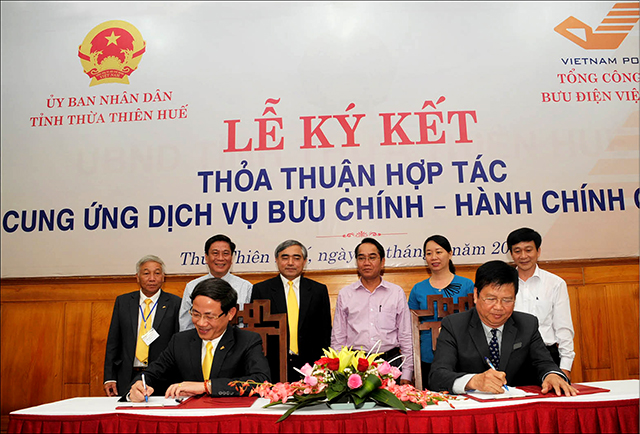 Phó Chủ tịch UBND tỉnh Nguyễn Dung ký kết Thỏa thuận cung ứng dịch vụ Bưu chính - Hành chính công với ông Phạm Anh Tuấn - Tổng Giám đốc Tổng công ty Bưu điện Việt Nam năm 2017