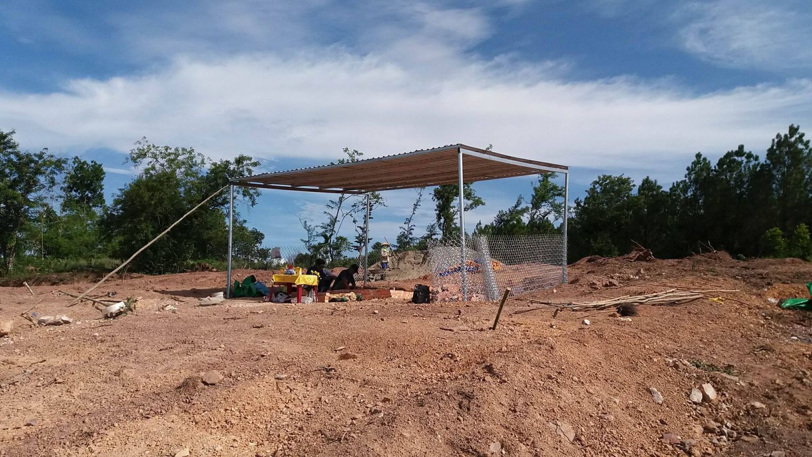 Khu vực phát hiện huyệt mộ tài nhân được che tạm bằng mái tôn