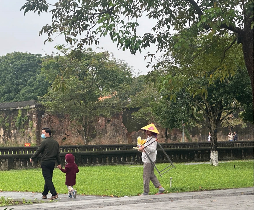 | Đeo bám du khách để bán hàng rong tại Đại nội Huế vẫn còn tiếp diễn. Ảnh: Ngọc Hòa |