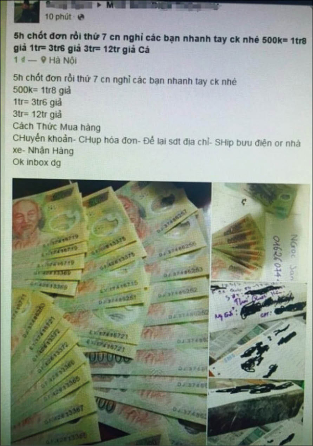 Còn chủ nhân của trang facebook “Trao doi tien” hướng dẫn cho tôi cách sử dụng… tiền giả. “Một triệu tiền thật đổi được 5 triệu đồng tiền giả. Tiền giả bên mình rất chất lượng, chỉ có máy soi của các ngân hàng mới có thể phát hiện. Khi sử dụng, bạn hãy dùng từng mệnh giá một, không nên sử dụng số lượng lớn. Và mình khuyên bạn nên về các vùng nông thôn, hay cây xăng để sử dụng”, chủ nhân trang facebook này hướng dẫn.