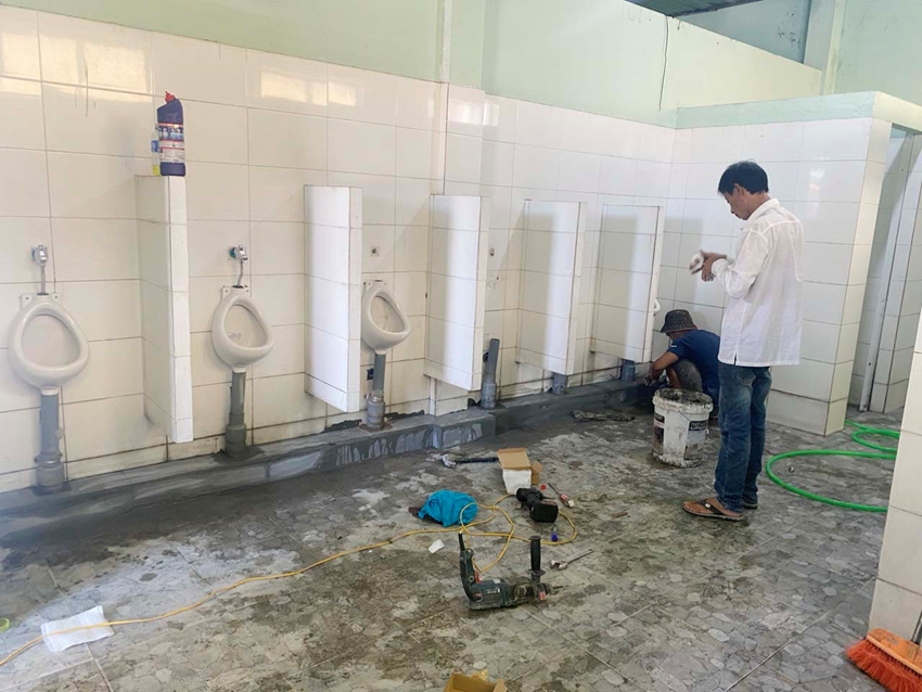 | Hệ thống bồn tiểu đang được thay mới và cấp nước, ống dẫn đảm bảo vệ sinh. Ảnh : PXS. |