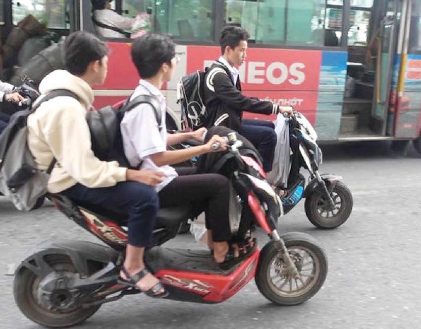 | Học sinh điều khiển xe máy điện không đội mũ bảo hiểm |