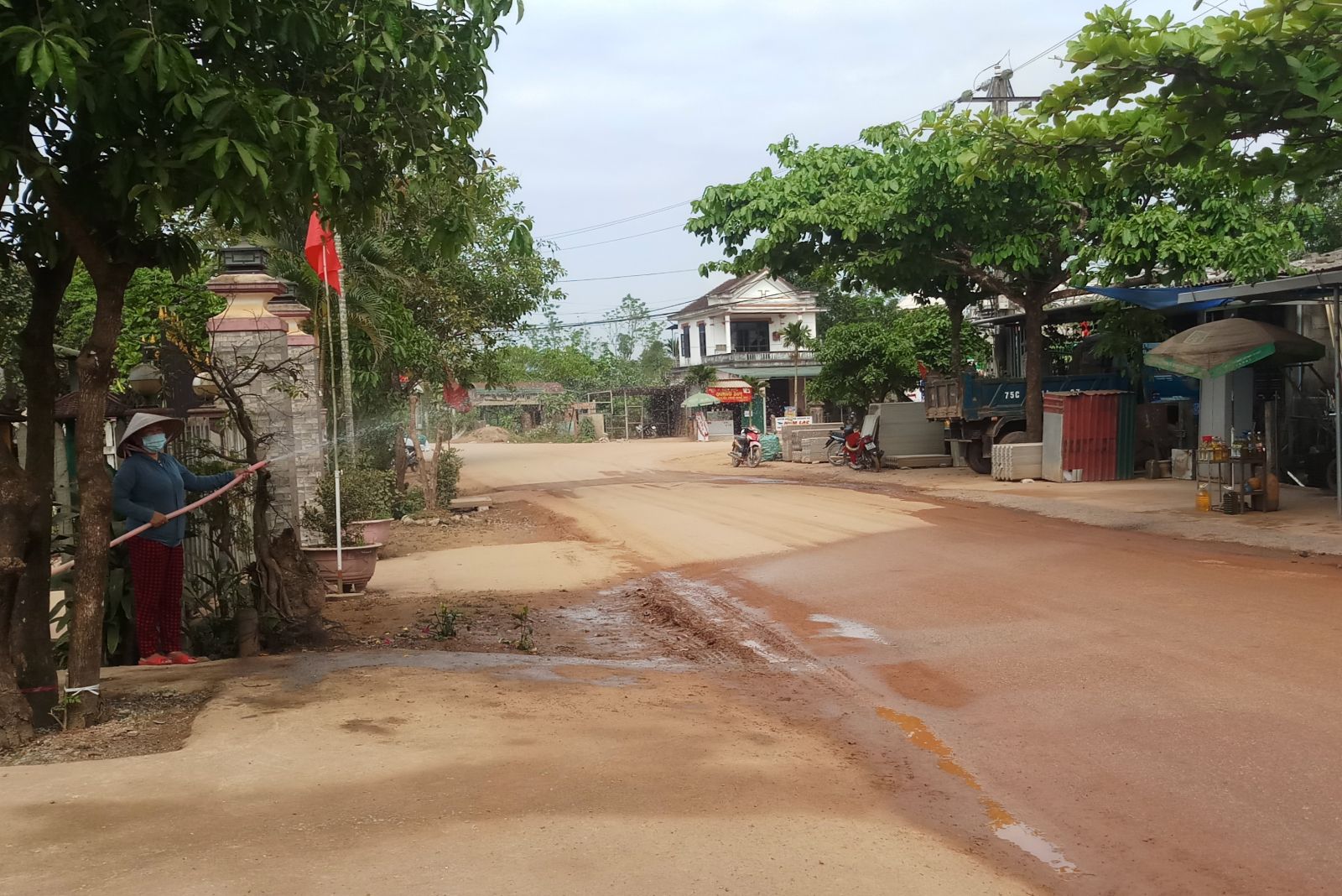 Người dân sống 2 bên đường phải tưới nước để giảm bụi do xe chạy quá nhiều