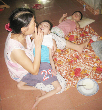 Trong ngôi nhà cấp bốn lợp tồn, nóng đến kinh người giữa thời tiết nắng gay gắt, chị Thu đang một mình “vật lộn” với hai đứa con sinh đôi 6 tuổi, bị bệnh bại não, chân tay teo tóp, thân hình chỉ như những đứa trẻ 2-3 tuổi. Hai đứa trẻ chỉ có thể nằm một chỗ, nên mọi sinh hoạt đều do người mẹ lo toan. Dưới nền nhà, bên cạnh 2 bé là tô cháo xay nhuyễn đã nguội ngắt nguội ngơ. Chị Thu đang luống cuống nâng đầu một bé mới bị sặc cháo, giọng nghẹn ngào: “Có khi phải mất cả mấy tiếng đồng hồ mới cho hai đứa ăn xong bữa. Lúc ăn, các cháu thường xuyên bị sặc như thế này, tội nghiệp lắm, đau lòng lắm, nhưng không làm gì được cho con bớt khổ”.