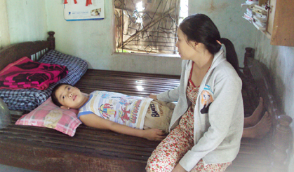 Chị Ngọc Minh rầu rĩ ngồi bên con đang bị bệnh