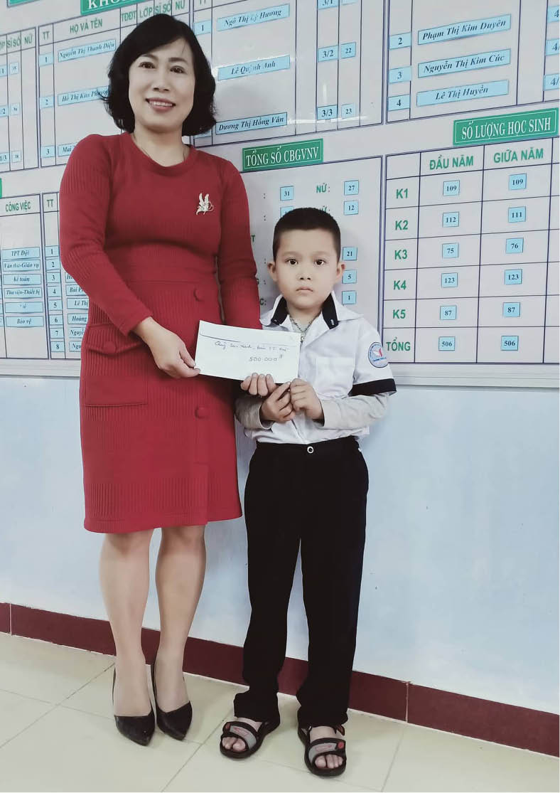Cô Nguyễn Thị Hoà, HT trường TH Kim Long thay mặt quỹ Sen Xanh trao quà cho em Toàn