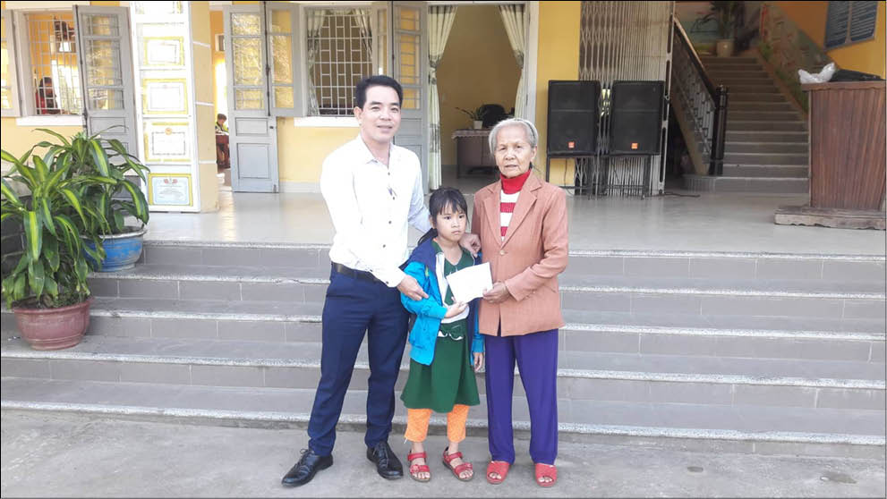 Hiệu trưởng Trường TH Phú Đa 3 trao quà cho bà cháu em Tú