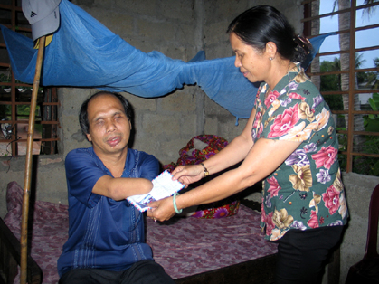 Chị Nguyễn Thị Hạnh, cán bộ thương binh xã hội phường Thủy Phương trao tiền bạn đọc cho anh Tiến