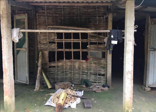 Trước đây gia đình chị Bình ở chung với ngoại, sau ngoại cho miếng đất nông nghiệp nằm lọt thỏm giữa khoảng ruộng sát chân núi để cất nhà. Tưởng chỉ là đặt tạm mấy tấm tôn nên nền đất đắp tạm vài năm rồi sẽ kiếm tiền xây cất, ai ngờ càng làm càng khó, nhất là khi bệnh tim xuất hiện, chị không đủ sức lao động, còn tốn thuốc thang nên căn lều cất tạm sau mấy năm càng hoang tàn.