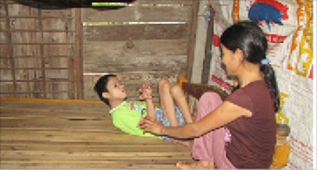 Bước vào căn nhà nhỏ, hình ảnh đầu tiên đập vào mắt chúng tôi là hai cụ già nằm trên hai chiếc giường gần như bất động. Nhìn ra phía căn lều nhỏ được che tạm bằng bao xi măng, một đứa trẻ nằm quằn quại ú a, ú ớ trên chiếc giường mục nát. Nhìn thấy chúng tôi, cậu bé vừa ú ớ, vừa đưa hai tay ra như muốn cầu xin một điều gì đó. Chị Thuỷ, vợ anh Cường đang lúi húi sau bếp, chạy lên: “Cháu nó 20 tuổi rồi đó chị, mẹ ruột sinh ra thấy nó vậy nên bỏ nhà ra đi, bỏ nó ở lại với ba và ông bà nội. Tui là vợ hai thôi”.