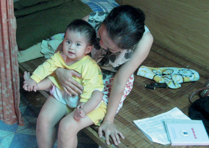 Tôi đến thăm “nhà” hai mẹ con, khi Thu Lan vừa trông mấy dãy “đồ bành” trước cửa, vừa chuẩn bị làm vệ sinh và cho bé “ăn”. Do trên cơ thể bé có ba “cửa mở” không chủ động, người mẹ luôn phải can thiệp, nên rất dễ nhiễm trùng. Thức ăn cũng phải chọn lọc, nấu thành nước rồi bơm vào ống chuyển trực tiếp vào dạ dày. Việc cho bé đại tiện còn cực nhọc hơn: phải dùng “xơ-ranh” bơm nước vào âm hộ cho phân loãng ra rồi hút, khiến bé rất đau đớn…