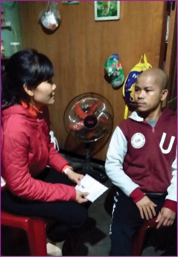 Chi hội trưởng Chi hội Phụ nữ thôn Tân Mỹ thay mặt nhà hảo tâm giấu tên trao tiền hỗ trợ cho anh Lê Hữu Gấm
