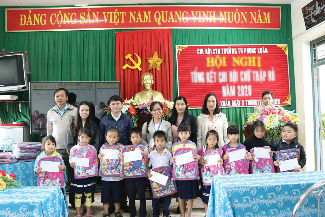 Giảng viên khoa Ngữ Văn trao quà cho các em trường TH Phong Xuân