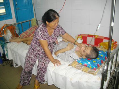 Là trụ cột chính trong gia đình, hằng ngày bà Phượng phải thức khuya dậy sớm gánh hàng rong đi bán. Thu nhập chẳng là bao, 2 mẹ con chỉ đủ sống qua ngày. Vậy mà, tai họa lại giáng xuống khi con trai bị tan nạn phải nằm viện. Mấy tháng nay, bà phải nghỉ buôn bán vào viện chăm sóc con. Không có thu nhập, lại thêm chi phí thuốc men và ăn uống của 2 mẹ con, dù tằn tiện cũng tốn hết 350.000 đồng/ngày. Bà Nguyễn Thị Ngãi, bệnh nhân nằm cùng phòng thở dài: “Hoàn cảnh của bà Phượng rất khó khăn và tội nghiệp. Một mình vừa ốm đau triền miên vừa phải chăm sóc cho đứa con liệt nửa người, không nói được do bị chấn thương sọ não”.