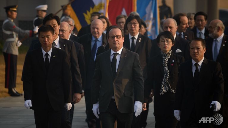 Tổng thống Pháp Francois Hollande (giữa) trong buổi lễ tại Nghĩa trang Quốc gia ở Seoul, Hàn Quốc sáng 4/11. Ảnh: AFP