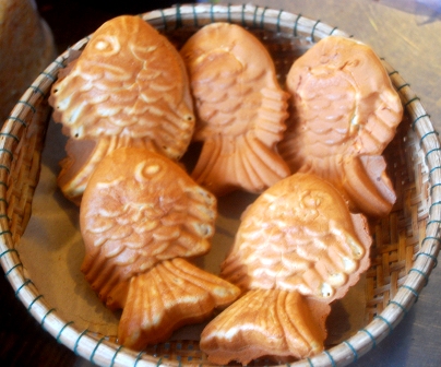 Những chiếc bánh cá nướng dễ thương đặt vào rổ tre phục vụ thực khách.