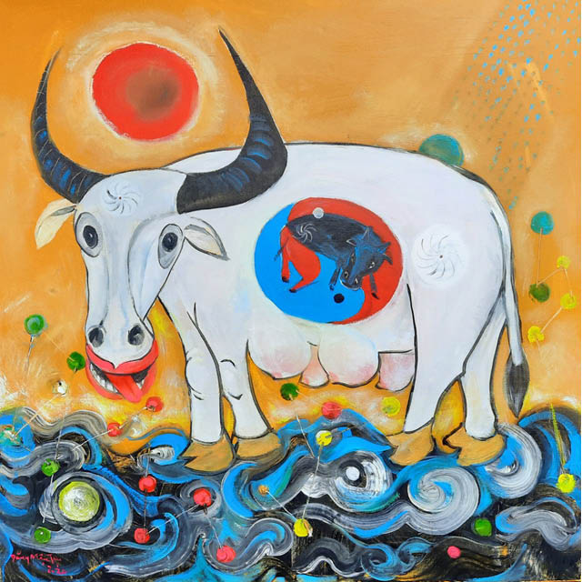 Nhiều bức tranh khác cũng vẽ con trâu với những hình ảnh mạnh mẽ qua cặp sừng sắc nhọn, linh hoạt, đôi mắt rực lửa, biểu hiện nguồn năng lượng mạnh mẽ. Cũng có khi, trâu hiền hòa, mộc mạc với hình ảnh ra đồng, đằm mình dưới sông nghênh đón mùa xuân… Không chỉ vẽ theo lối tả thực hay trừu tượng, hình tượng con giáp năm nay còn được thể hiện qua nét vẽ dân gian, bằng gốm, sắp đặt để kể cho mọi người câu chuyện trong năm mới.
