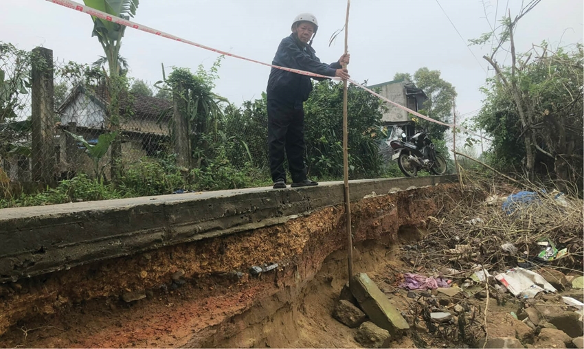 Một trong những điểm sạt lở nặng là tuyến đường chạy dọc nhánh sông Ô Hô, kết nối sông Bồ nằm ở khu vực tổ dân phố (TDP) Tứ Chánh. Do mưa lớn làm nước sông dâng cao, xói sâu vào nền đường, cuốn trôi khá nhiều phần đất dưới chân taluy âm. Hiện mặt đường bị sụt lún và hai bên tạo thành nhiều khe nứt dài dần 500m, bề rộng khe nứt có nơi rộng từ 0,3 - 0,5m, khiến tuyến đường bị thu hẹp dần.